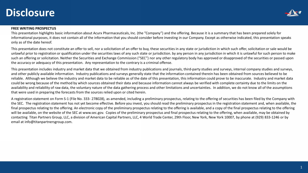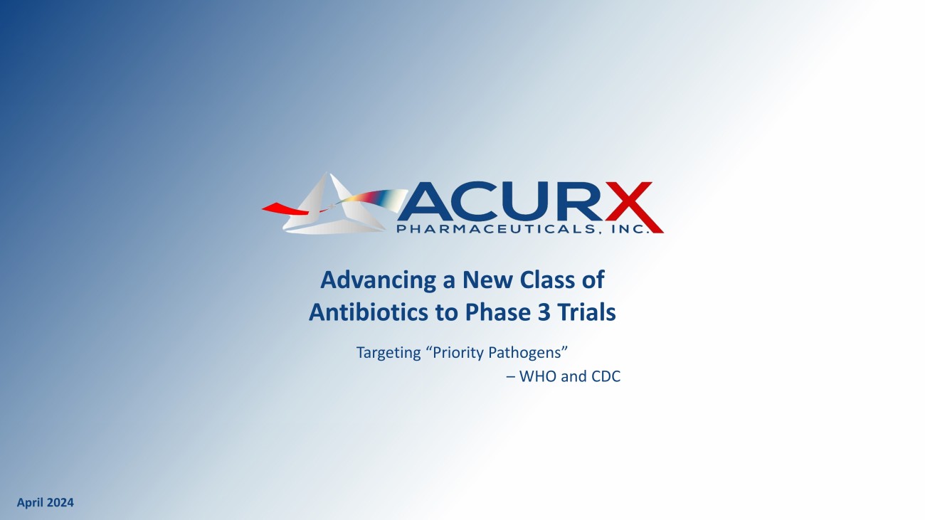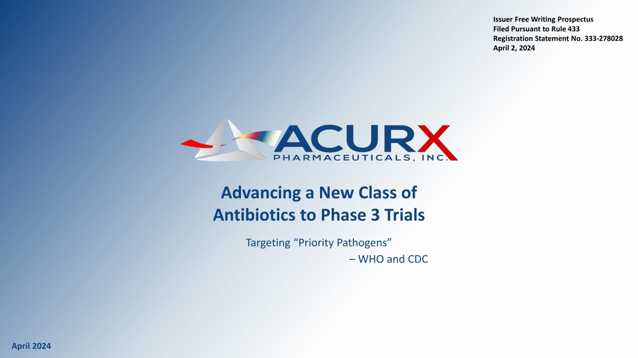 Disclosure 1 FREE WRITING PROSPECTUS This presentation highlights basic information about Acurx Pharmaceuticals, Inc. (the ”Company”) and the offering. Because it is a summary that has been prepared solely for informational purposes, it does not contain all of the information that you should consider before investing in our Company. Exc ept as otherwise indicated, this presentation speaks only as of the date hereof. This presentation does not constitute an offer to sell, nor a solicitation of an offer to buy, these securities in any state or jurisdiction in which such offer, solicitation or sale would be unlawful prior to registration or qualification under the securities laws of any such state or jurisdiction. by any person in an y jurisdiction in which it is unlawful for such person to make such an offering or solicitation. Neither the Securities and Exchange Commission (“SEC”) nor any other regulatory body has ap pro ved or disapproved of the securities or passed upon the accuracy or adequacy of this presentation. Any representation to the contrary is a criminal offense. This presentation includes industry and market data that we obtained from industry publications and journals, third - party studie s and surveys, internal company studies and surveys, and other publicly available information. Industry publications and surveys generally state that the information contained t her ein has been obtained from sources believed to be reliable. Although we believe the industry and market data to be reliable as of the date of this presentation, this informat ion could prove to be inaccurate. Industry and market data could be wrong because of the method by which sources obtained their data and because information cannot always be verified w ith complete certainty due to the limits on the availability and reliability of raw data, the voluntary nature of the data gathering process and other limitations and uncert ain ties. In addition, we do not know all of the assumptions that were used in preparing the forecasts from the sources relied upon or cited herein. A registration statement on Form S - 1 (File No. 333 - 278028), as amended, including a preliminary prospectus, relating to the off ering of securities has been filed by the Company with the SEC. The registration statement has not yet become effective. Before you invest, you should read the preliminary prospec tus in the registration statement and, when available, the final prospectus relating to the offering. An electronic copy of the preliminary prospectus relating to the offering is avail abl e, and a copy of the final prospectus relating to the offering will be available, on the website of the SEC at www.sec.gov. Copies of the preliminary prospectus and final prospectus relat ing to the offering, when available, may be obtained by contacting Titan Partners Group, LLC, a division of American Capital Partners, LLC, 4 World Trade Center, 29th Floor, New Yo rk, New York 10007, by phone at (929) 833 - 1246 or by email at info@titanpartnersgroup.com .