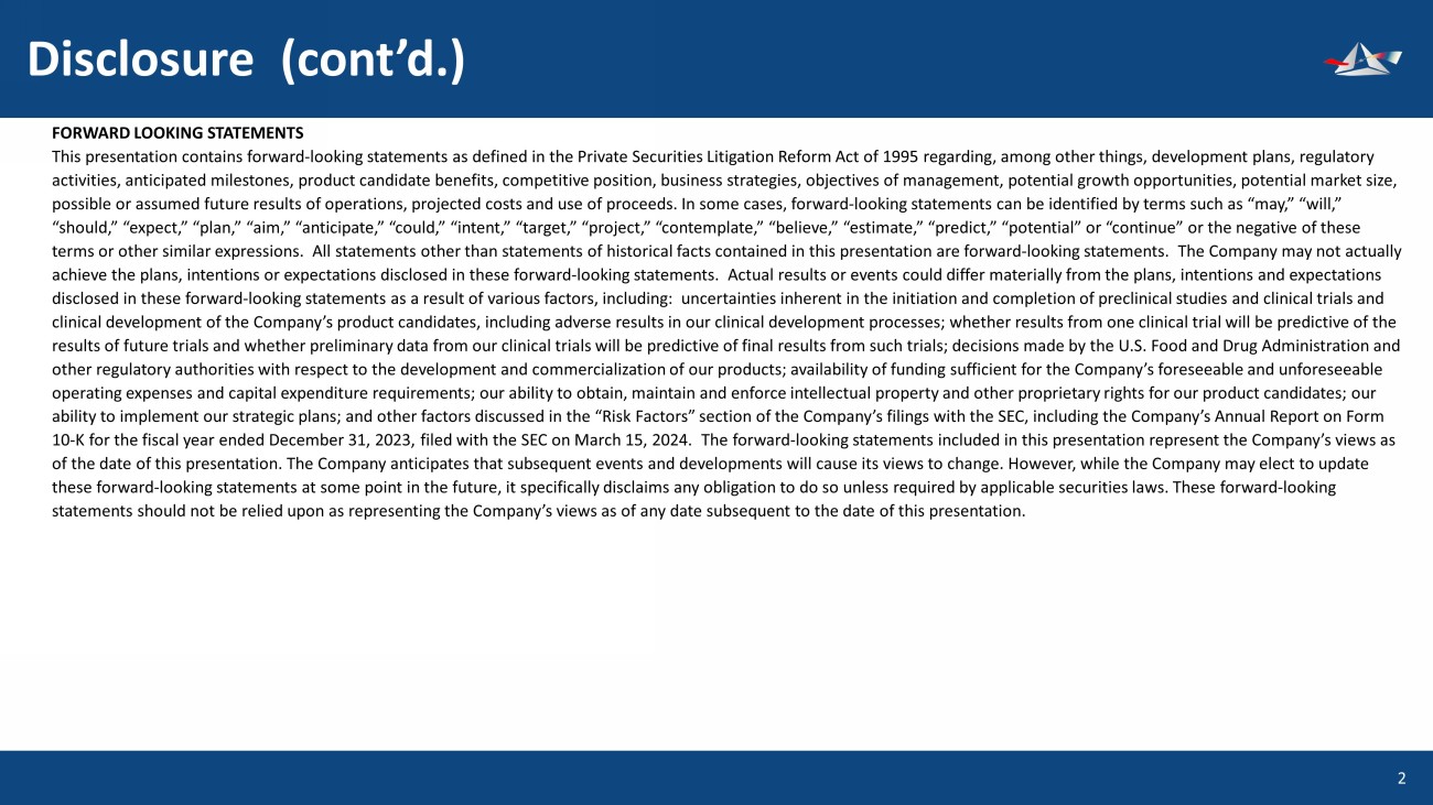 Disclosure (cont’d.) FORWARD LOOKING STATEMENTS This presentation contains forward - looking statements as defined in the Private Securities Litigation Reform Act of 1995 regardi ng, among other things, development plans, regulatory activities, anticipated milestones, product candidate benefits, competitive position, business strategies, objectives of mana gem ent, potential growth opportunities, potential market size, possible or assumed future results of operations, projected costs and use of proceeds. In some cases, forward - looking statements can be identified by terms such as “may,” “will,” “should,” “expect,” “plan,” “aim,” “anticipate,” “could,” “intent,” “target,” “project,” “contemplate,” “believe,” “estimate, ” “ predict,” “potential” or “continue” or the negative of these terms or other similar expressions. All statements other than statements of historical facts contained in this presentation are forward - looking statements. The Company may not actually achieve the plans, intentions or expectations disclosed in these forward - looking statements. Actual results or events could dif fer materially from the plans, intentions and expectations disclosed in these forward - looking statements as a result of various factors, including: uncertainties inherent in the initiati on and completion of preclinical studies and clinical trials and clinical development of the Company’s product candidates, including adverse results in our clinical development processes; wh eth er results from one clinical trial will be predictive of the results of future trials and whether preliminary data from our clinical trials will be predictive of final results from such tri als; decisions made by the U.S. Food and Drug Administration and other regulatory authorities with respect to the development and commercialization of our products; availability of funding s uff icient for the Company’s foreseeable and unforeseeable operating expenses and capital expenditure requirements; our ability to obtain, maintain and enforce intellectual property an d o ther proprietary rights for our product candidates; our ability to implement our strategic plans; and other factors discussed in the “Risk Factors” section of the Company’s filings wit h the SEC, including the Company’s Annual Report on Form 10 - K for the fiscal year ended December 31, 2023, filed with the SEC on March 15, 2024. The forward - looking statements included in this presentation represent the Company’s views as of the date of this presentation. The Company anticipates that subsequent events and developments will cause its views to cha nge . However, while the Company may elect to update these forward - looking statements at some point in the future, it specifically disclaims any obligation to do so unless required by applicable securities laws. These forward - looking statements should not be relied upon as representing the Company’s views as of any date subsequent to the date of this presen tat ion. 2