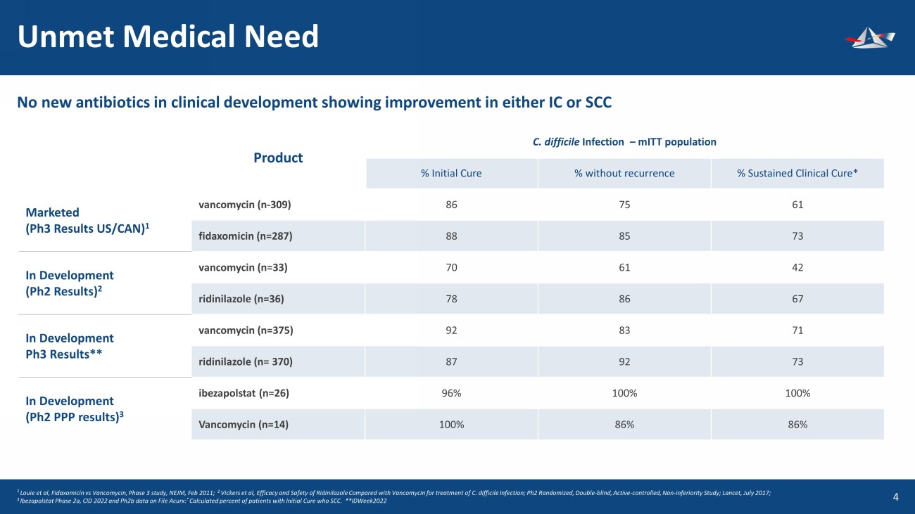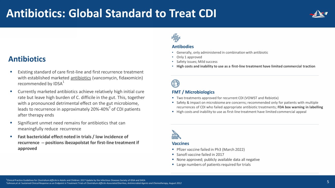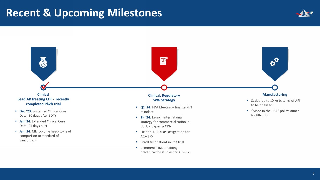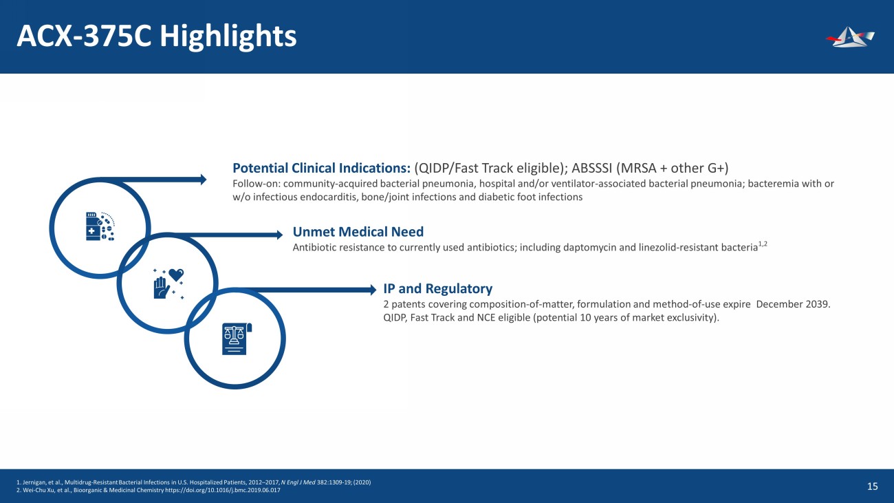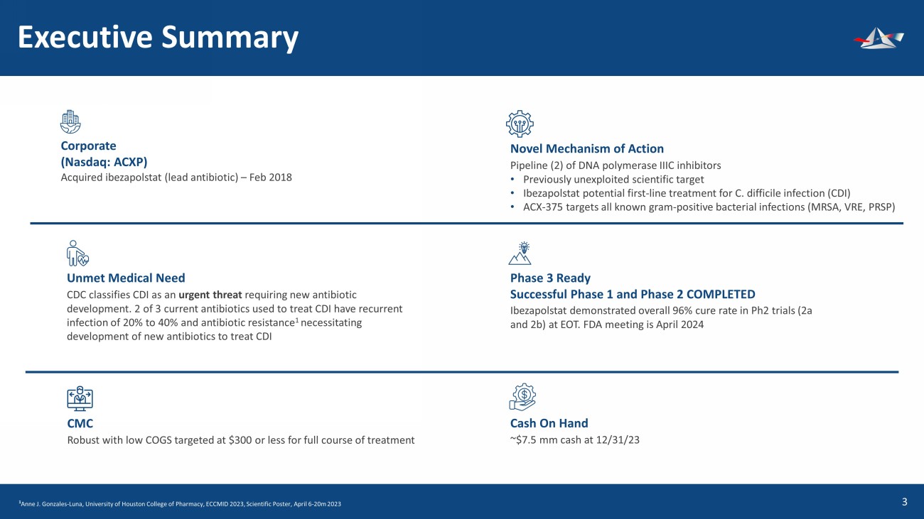 &UHDWHGE\%(-281 IURPWKH1RXQ3URMHFW &UHDWHGE\(NR3XUQRPR IURPWKH1RXQ3URMHFW &UHDWHGE\177 IURPWKH1RXQ3URMHFW &UHDWHGE\.LUDQ6KDVWU\ IURPWKH1RXQ3URMHFW Executive Summary 4 Corporate (Nasdaq: ACXP) Acquired ibezapolstat (lead antibiotic) – Feb 2018 &UHDWHGE\NDNKLP IURP1RXQ3URMHFW Unmet Medical Need CDC classifies CDI as an urgent threat requiring new antibiotic development. 2 of 3 current antibiotics used to treat CDI have recurrent infection of 20% to 40% and antibiotic resistance 1 necessitating development of new antibiotics to treat CDI CMC Robust with low COGS targeted at $300 or less for full course of treatment Novel Mechanism of Action Pipeline (2) of DNA polymerase IIIC inhibitors • Previously unexploited scientific target • Ibezapolstat potential first - line treatment for C. difficile infection (CDI) • ACX - 375 targets all known gram - positive bacterial infections (MRSA, VRE, PRSP) Phase 3 Ready Successful Phase 1 and Phase 2 COMPLETED Ibezapolstat demonstrated overall 96% cure rate in Ph2 trials (2a and 2b) at EOT. FDA meeting is April 2024 Cash On Hand ~$7.5 mm cash at 12/31/23 1 Anne J. Gonzales - Luna, University of Houston College of Pharmacy, ECCMID 2023, Scientific Poster, April 6 - 20m 2023 &UHDWHGE\.DQ.LQJSHWFKDUDW IURPWKH1RXQ3URMHFW