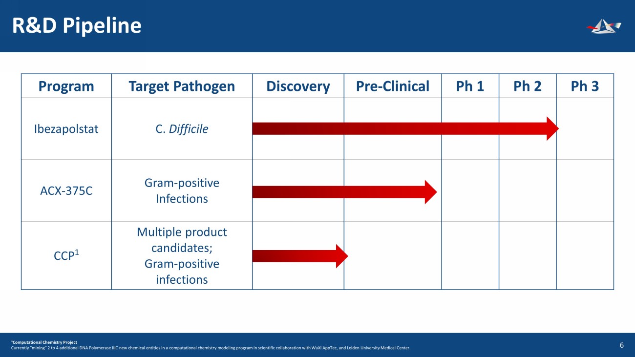 Program Target Pathogen Discovery Pre - Clinical Ph 1 Ph 2 Ph 3 Ibezapolstat C. Difficile ACX - 375C Gram - positive Infections CCP 1 Multiple product candidates; Gram - positive infections R&D Pipeline 7 1 Computational Chemistry Project Currently “mining” 2 to 4 additional DNA Polymerase IIIC new chemical entities in a computational chemistry modeling program in scientific collaboration with WuXi AppTec, and Leiden University Medical Center.
