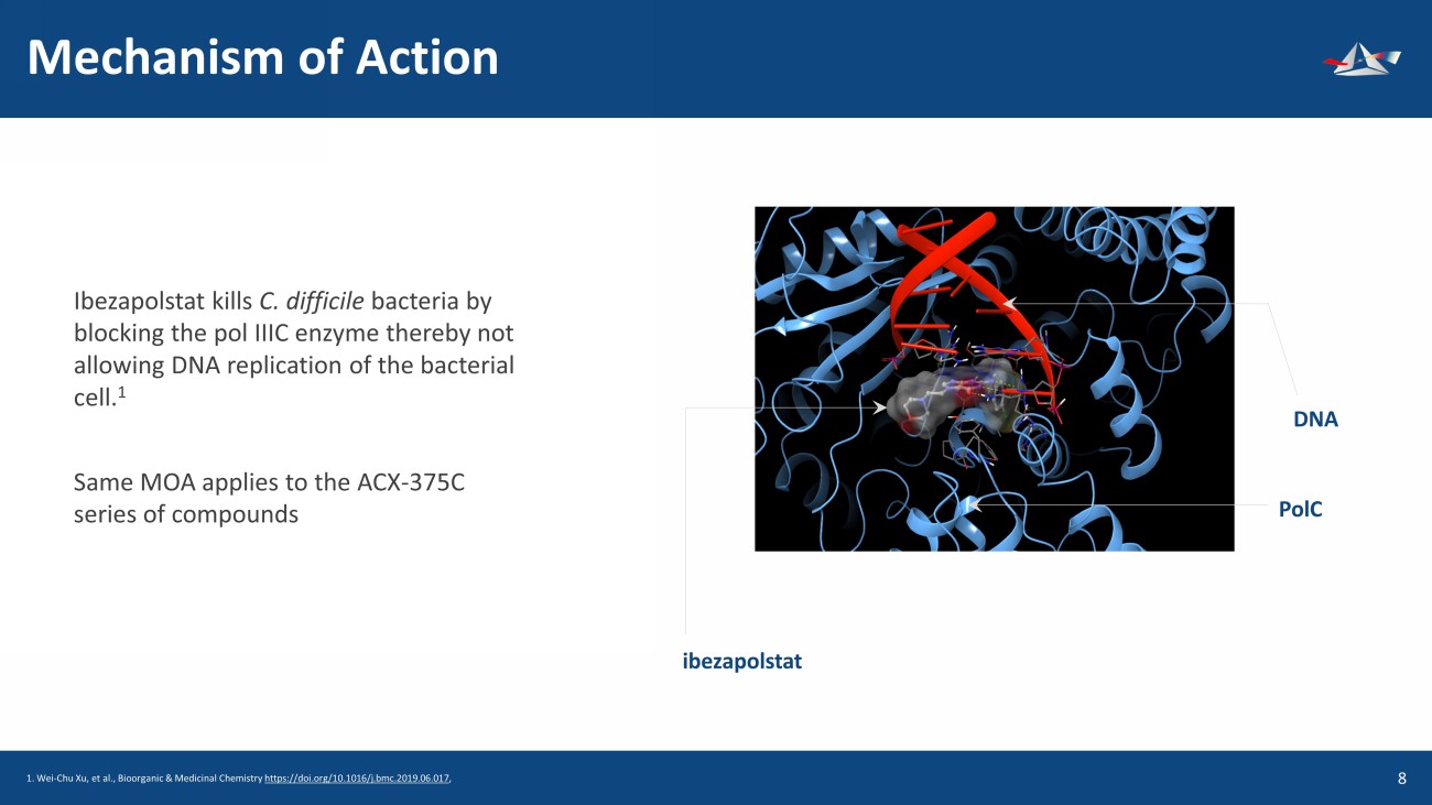 Mechanism of Action 9 Ibezapolstat kills C. difficile bacteria by blocking the pol IIIC enzyme thereby not allowing DNA replication of the bacterial cell. 1 Same MOA applies to the ACX - 375C series of compounds ibezapolstat DNA PolC 1. Wei - Chu Xu, et al., Bioorganic & Medicinal Chemistry https://doi.org/10.1016/j.bmc.2019.06.017 ,