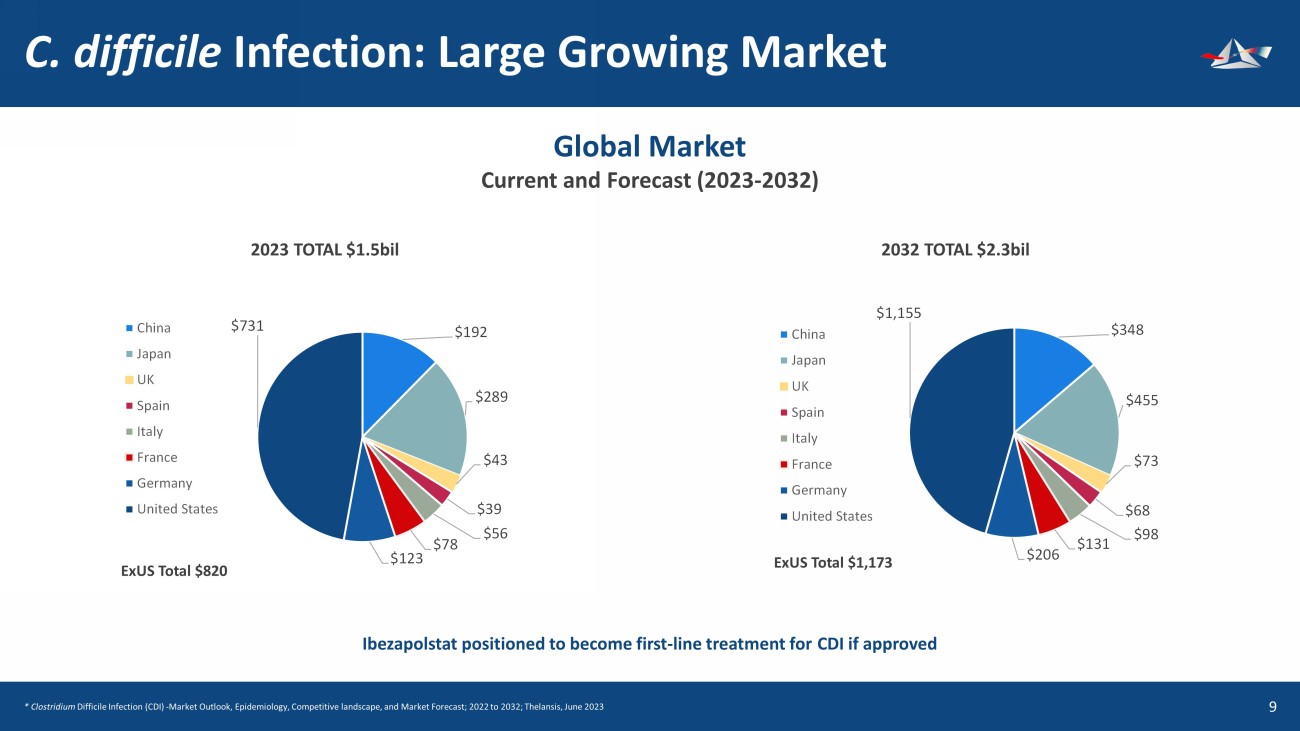 Recent & Upcoming Milestones 8 Clinical Lead AB treating CDI - recently completed Ph2b trial ▪ Dec ‘23 : Sustained Clinical Cure Data (30 days after EOT) ▪ Jan ’24: Extended Clinical Cure Data (94 days out) ▪ Jan ‘24 : Microbiome head - to - head comparison to standard of vancomycin Clinical, Regulatory WW Strategy ▪ Q2 ’24: FDA Meeting – finalize Ph3 mandate ▪ 2H ‘24: Launch international strategy for commercialization in EU, UK, Japan & CDN ▪ File for FDA QIDP Designation for ACX - 375 ▪ Enroll first patient in Ph3 trial ▪ Commence IND - enabling preclinical tox studies for ACX - 375 Manufacturing ▪ Scaled up to 10 kg batches of API to be finalized ▪ “Made in the USA” policy launch for fill/finish &UHDWHGE\DILDQURF IURPWKH1RXQ3URMHFW x &UHDWHGE\JO\SK IDLVDORYHUV IURPWKH1RXQ3URMHFW