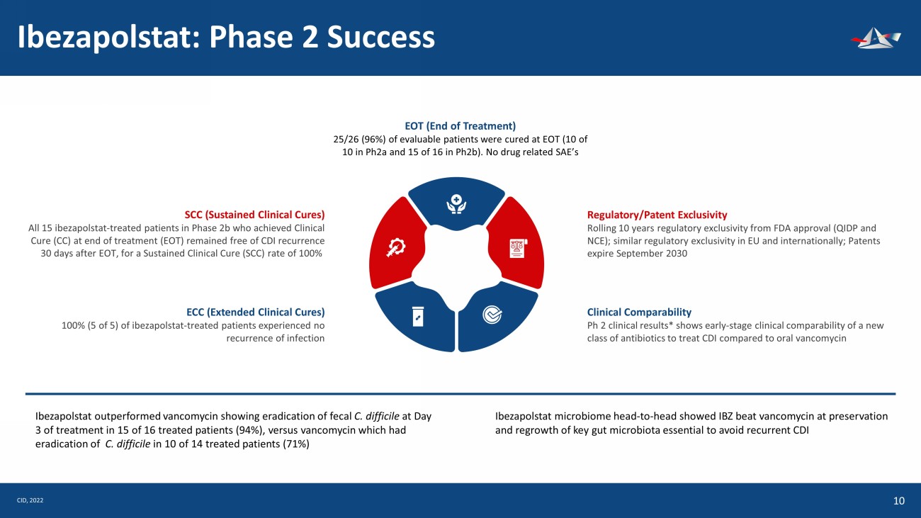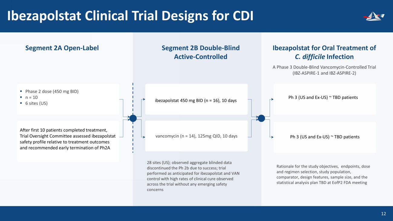 Ibezapolstat: Phase 2 Success 11 EOT (End of Treatment) 25/26 (96%) of evaluable patients were cured at EOT (10 of 10 in Ph2a and 15 of 16 in Ph2b). No drug related SAE’s SCC (Sustained Clinical Cures) All 15 ibezapolstat - treated patients in Phase 2b who achieved Clinical Cure (CC) at end of treatment (EOT) remained free of CDI recurrence 30 days after EOT, for a Sustained Clinical Cure (SCC) rate of 100% ECC (Extended Clinical Cures) 100% (5 of 5) of ibezapolstat - treated patients experienced no recurrence of infection Regulatory/Patent Exclusivity Rolling 10 years regulatory exclusivity from FDA approval (QIDP and NCE); similar regulatory exclusivity in EU and internationally; Patents expire September 2030 Clinical Comparability Ph 2 clinical results* shows early - stage clinical comparability of a new class of antibiotics to treat CDI compared to oral vancomycin Ibezapolstat outperformed vancomycin showing eradication of fecal C. difficile at Day 3 of treatment in 15 of 16 treated patients (94%), versus vancomycin which had eradication of C. difficile in 10 of 14 treated patients (71%) Ibezapolstat microbiome head - to - head showed IBZ beat vancomycin at preservation and regrowth of key gut microbiota essential to avoid recurrent CDI CID, 2022 &UHDWHGE\DILDQURF IURPWKH1RXQ3URMHFW &UHDWHGE\.DPLQ*LQNDHZ IURPWKH1RXQ3URMHFW &UHDWHGE\DILDQURF IURPWKH1RXQ3URMHFW