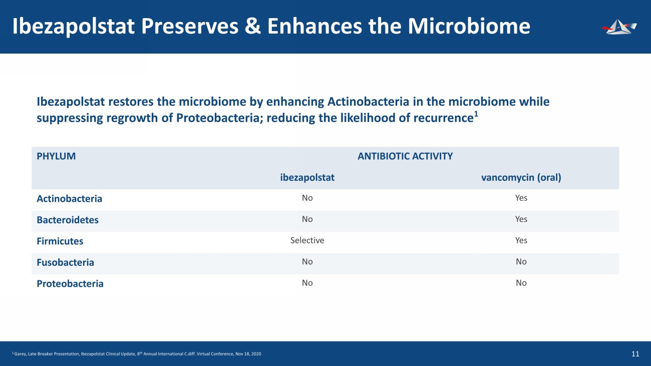 C. difficile Infection: Large Growing Market 10 $192 $289 $43 $39 $56 $78 $123 $731 China Japan UK Spain Italy France Germany United States $348 $455 $73 $68 $98 $131 $206 $1,155 China Japan UK Spain Italy France Germany United States Global Market Current and Forecast (2023 - 2032) 2023 TOTAL $1.5bil 2032 TOTAL $2.3bil ExUS Total $820 ExUS Total $1,173 Ibezapolstat positioned to become first - line treatment for CDI if approved * Clostridium Difficile Infection (CDI) - Market Outlook, Epidemiology, Competitive landscape, and Market Forecast; 2022 to 2032; Thelansis, J une 2023