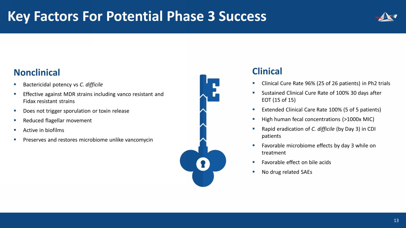 Ibezapolstat Preserves & Enhances the Microbiome 12 Ibezapolstat restores the microbiome by enhancing Actinobacteria in the microbiome while suppressing regrowth of Proteobacteria ; reducing the likelihood of recurrence 1 PHYLUM ANTIBIOTIC ACTIVITY ibezapolstat vancomycin (oral) Actinobacteria No Yes Bacteroidetes No Yes Firmicutes Selective Yes Fusobacteria No No Proteobacteria No No 1 Garey, Late - Breaker Presentation, Ibezapolstat Clinical Update, 8 th Annual International C.diff. Virtual Conference, Nov 18, 2020