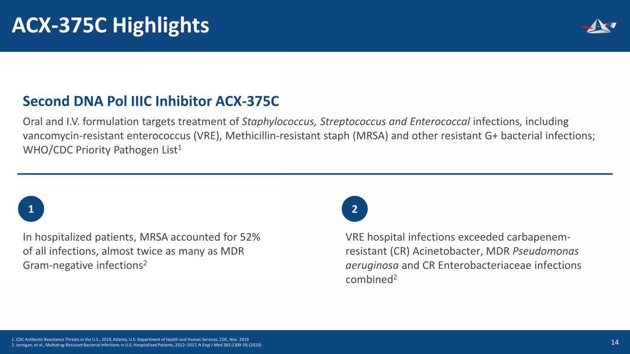 ACX - 375C Highlights 15 VRE hospital infections exceeded carbapenem - resistant (CR) Acinetobacter, MDR Pseudomonas aeruginosa and CR Enterobacteriaceae infections combined 2 Second DNA Pol IIIC Inhibitor ACX - 375C Oral and I.V. formulation targets treatment of Staphylococcus, Streptococcus and Enterococcal infections , including vancomycin - resistant enterococcus (VRE), Methicillin - resistant staph (MRSA) and other resistant G+ bacterial infections; WHO/CDC Priority Pathogen List 1 In hospitalized patients, MRSA accounted for 52% of all infections, almost twice as many as MDR Gram - negative infections 2 1. CDC Antibiotic Resistance Threats in the U.S., 2019, Atlanta, U.S. Department of Health and Human Services, CDC, Nov. 2019 2. Jernigan, et al., Multidrug - Resistant Bacterial Infections in U.S. Hospitalized Patients, 2012 – 2017, N Engl J Med 382:1309 - 19; (2020) 1 2