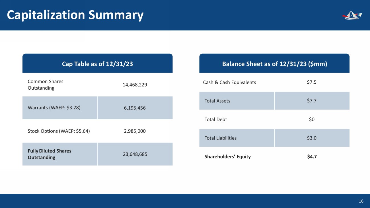 Capitalization Summary 17 Common Shares Outstanding Warrants (WAEP: $3.28) Stock Options (WAEP: $5.64) Fully D iluted S hares O utstanding 14,468,229 6,195,456 2,985,000 23,648,685 Cap Table as of 12/31/23 Cash & Cash Equivalents Total Assets Total Debt Shareholders’ Equity $7.5 $7.7 $0 $4.7 Balance Sheet as of 12/31/23 ($mm) Total Liabilities $3.0