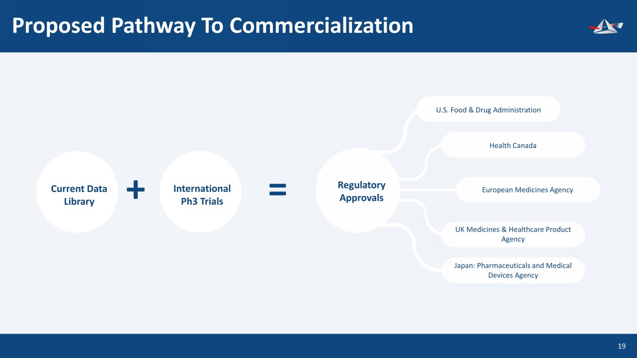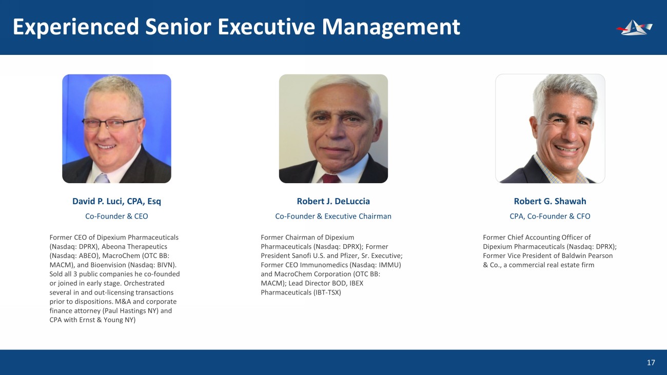 Experienced Senior Executive Management 18 David P. Luci, CPA, Esq Co - Founder & CEO Robert J. DeLuccia Co - Founder & Executive Chairman Robert G. Shawah CPA, Co - Founder & CFO Former CEO of Dipexium Pharmaceuticals (Nasdaq: DPRX), Abeona Therapeutics (Nasdaq: ABEO), MacroChem (OTC BB: MACM), and Bioenvision (Nasdaq: BIVN). Sold all 3 public companies he co - founded or joined in early stage. Orchestrated several in and out - licensing transactions prior to dispositions. M&A and corporate finance attorney (Paul Hastings NY) and CPA with Ernst & Young NY) Former Chairman of Dipexium Pharmaceuticals (Nasdaq: DPRX); Former President Sanofi U.S. and Pfizer, Sr. Executive; Former CEO Immunomedics (Nasdaq: IMMU) and MacroChem Corporation (OTC BB: MACM); Lead Director BOD, IBEX Pharmaceuticals (IBT - TSX) Former Chief Accounting Officer of Dipexium Pharmaceuticals (Nasdaq: DPRX); Former Vice President of Baldwin Pearson & Co., a commercial real estate firm