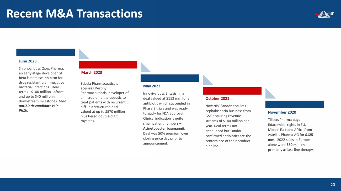 Recent M&A Transactions 21 June 2023 Shionogi buys Qpex Pharma, an early - stage developer of beta lactamase inhibitor for drug resistant gram - negative bacterial infections. Deal terms - $100 million upfront and up to $40 million in downstream milestones. Lead antibiotic candidate is in Ph1b . March 2023 May 202 2 Innoviva buys Entasis, in a deal valued at $113 mm for an antibiotic which succeeded in Phase 3 trials and was ready to apply for FDA approval. Clinical indication is quite small patient numbers – Acinetobacter baumannii . Deal was 50% premium over closing price day prior to announcement. October 2021 Novartis’ Sandoz acquires cephalosporin business from GSK acquiring revenue streams of $140 million per year. Deal terms not announced but Sandoz confirmed antibiotics are the centerpiece of their product pipeline. November 2020 Tillotts Pharma buys fidaxomicin rights in EU, Middle East and Africa from Astellas Pharma AG for $125 mm . 2022 sales in Europe alone were $80 million primarily as last - line therapy. Sebela Pharmaceuticals acquires Destiny Pharmaceuticals, developer of a microbiome therapeutic to treat patients with recurrent C diff, in a structured deal valued at up to $570 million plus tiered double - digit royalties.