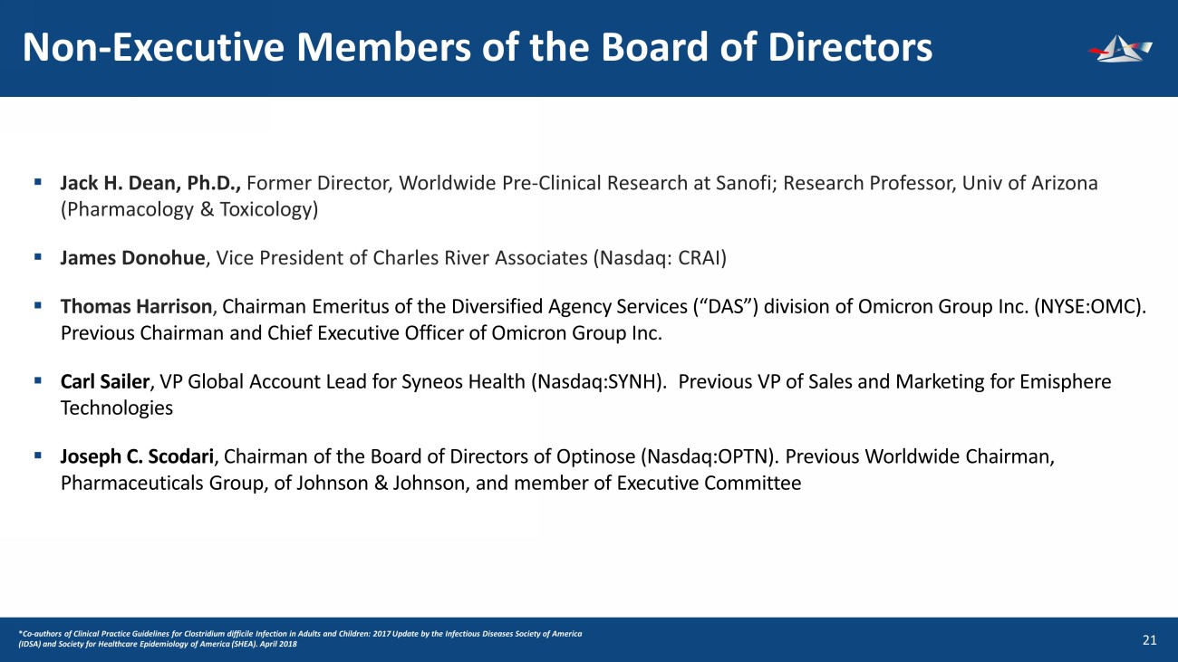 Non - Executive Members of the Board of Directors 22 ▪ Jack H. Dean , Ph.D., Former Director, Worldwide Pre - Clinical Research at Sanofi; Research Professor, Univ of Arizona (Pharmacology & Toxicology) ▪ James Donohue , Vice President of Charles River Associates (Nasdaq: CRAI) ▪ Thomas Harrison , Chairman Emeritus of the Diversified Agency Services (“DAS”) division of Omicron Group Inc. (NYSE:OMC). Previous Chairman and Chief Executive Officer of Omicron Group Inc. ▪ Carl Sailer , VP Global Account Lead for Syneos Health (Nasdaq:SYNH). Previous VP of Sales and Marketing for Emisphere Technologies ▪ Joseph C. Scodari , Chairman of the Board of Directors of Optinose (Nasdaq:OPTN). Previous Worldwide Chairman, Pharmaceuticals Group, of Johnson & Johnson, and member of Executive Committee * Co - authors of Clinical Practice Guidelines for Clostridium difficile Infection in Adults and Children: 2017 Update by the Infect ious Diseases Society of America (IDSA) and Society for Healthcare Epidemiology of America (SHEA). April 2018